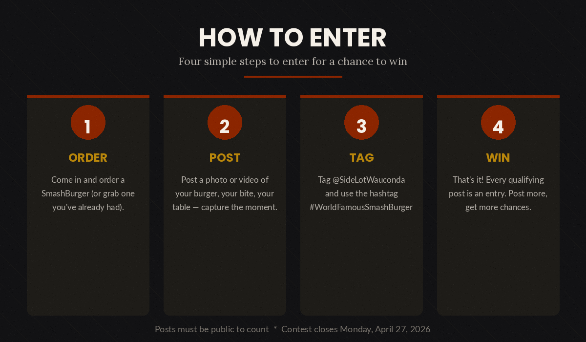 One lucky winner will be chosen by The Side Lot. Your prize covers one Double SmashBurger per visit (dine-in only) from May 1 through August 31, 2026. Limit one burger per day.