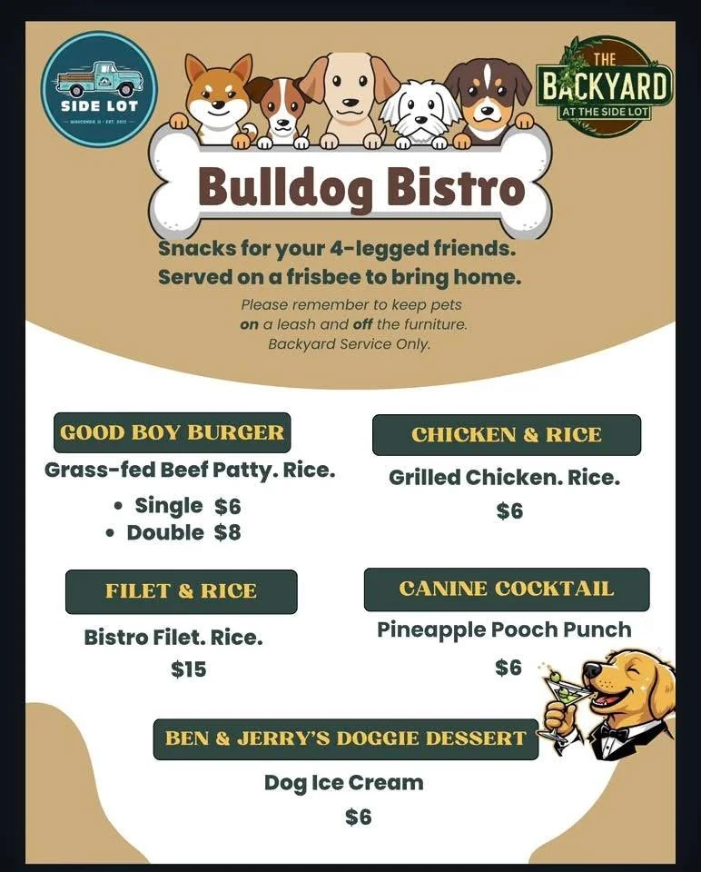 The Side Lot is happy to offer the Bulldog Bistro Menu again for your four-legged friends in the Backyard this summer. All dishes are served on a frisbee so you and your pooch can go home and play later.